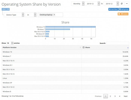 不過(guò),Windows 7作為一款已經(jīng)問(wèn)世十年的操作系統(tǒng),用戶基數(shù)依舊龐大。據(jù)市場(chǎng)調(diào)查機(jī)構(gòu)Netmarketshare發(fā)布的報(bào)告顯示,2019年12月,Windows 10系統(tǒng)市場(chǎng)份額占比達(dá)到54.62%,而Windows 7位居第二,為26.64%。